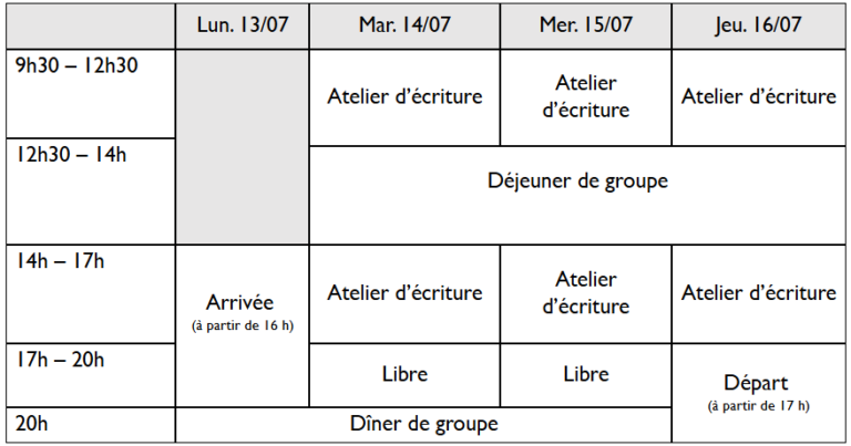 Un temps de bilan invite chacun, en fin de stage, à revenir sur ses attentes. Chaque participant est en outre invité à remplir le document-type de bilan qui lui a sera adressé par mail à la fin de l’atelier.